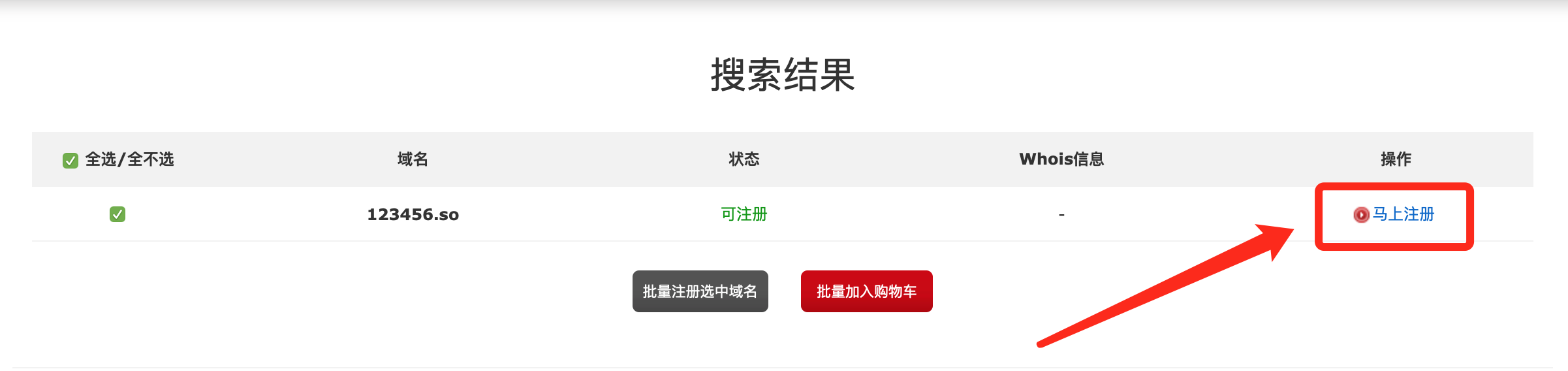 3、显示【可注册】状态,即刻点击【马上】进行域名注册